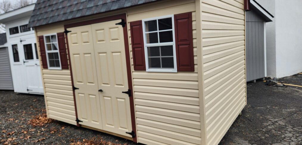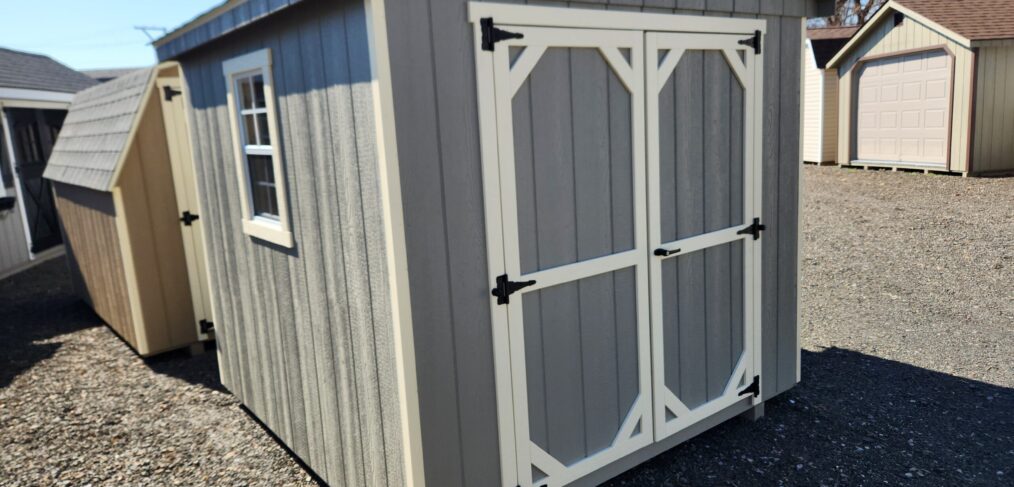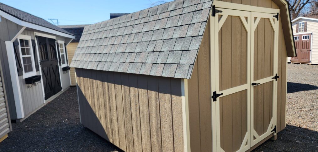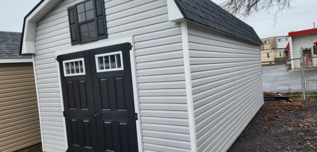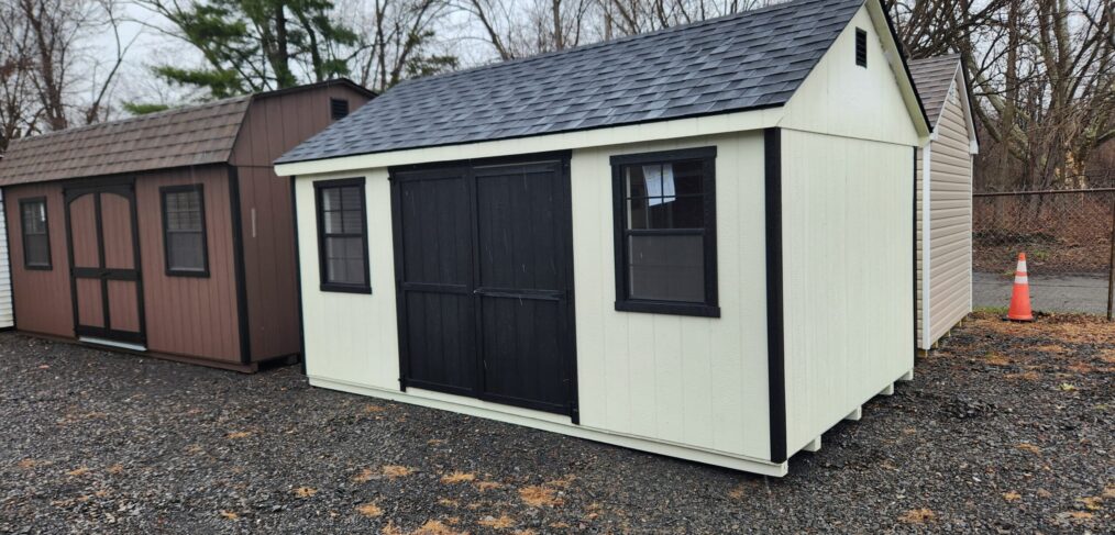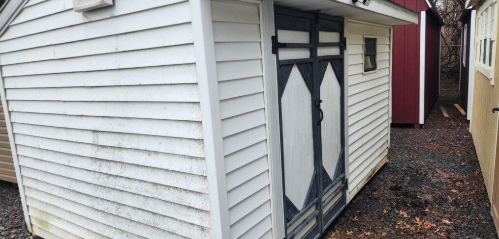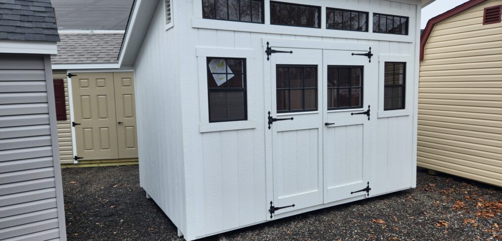 7′ walls, painted black doors with Transom glass 10′ roll roof vent 2)4×11 lofts, 2 3×12 lofts, 2×20 work bench 12″ on center joists, 8″ gable end overhang